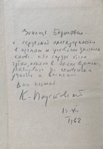 Букинистическая книга в издательском иллюстрированном переплете. Ледериновый корешок. В очень хорошем состоянии. Прижизненное издание автора. На авантитуле развернутый автограф автора: «Зинаиде Борисовне, с сердечной благодарностью в прямом и условном значениях слова, ибо сердце стало чутко, нежели в былые времена, реагировать не человеческое участие и внимание <...> К. Паустовский 13(15)-VII 1962». "Бросок на юг" представляет собой повесть Константина Паустовского, продолжение, а точнее - пятую часть, автобиографического цикла. В произведении описаны несколько месяцев жизни Паустовского на Кавказе в начале 1920-х годов. Как и в предыдущих книгах цикла, содержание повести составляют впечатления, сцены, эпизоды и характеристики друзей и недругов, встречи со многими людьми, зарисовки природы и быта - из всего этого по крупицам складывается своеобразный облик времени, увиденный глазами автора в те годы его жизни.