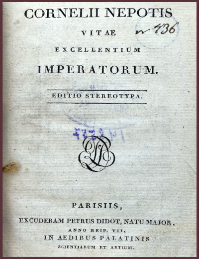Корнелий Непот (99-24 гг. до н.э.) - известный римский историк, друг Аттика, оратора Цицерона, Катулла. Помимо любовных стихотворений, первым произведением его была хроника в трех книгах, написанная примерно в 54 году до нашей эры, представлявшая собой синхронистические таблицы, сопоставлявшие важнейшие события в истории Греции и Рима. Позднейшие его труды написаны с предпочтением к истории культуры и биографиям. Сюда относятся пять книг "Exempla", подробные жизнеописания Катона Старшего и Цицерона. Благодаря простому стилю произведения Корнелия традиционно использовались при обучении латыни наряду с "Записками о Галльской войне" Юлия Цезаря. Непот входил в число "школьных авторов" в России XIX века, и его книга неоднократно переиздавалась в оригинале с примечаниями.