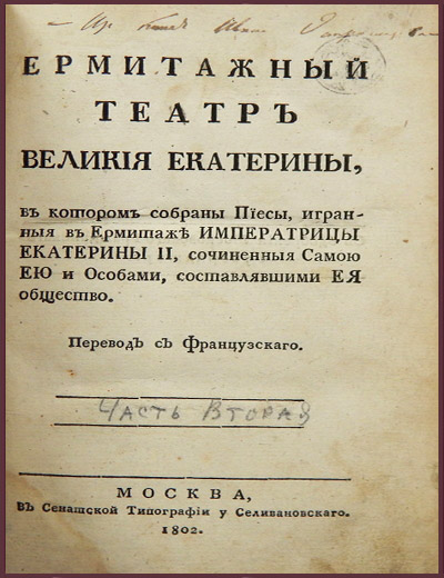 Ермитажный театр Великия Екатерины, в котором собраны пьесы, игранные в Ермитаже Императрицы Екатерины II, сочиненные самою Ею и Особами, составлявшими Ея общество, ч.2 (1802 г.)