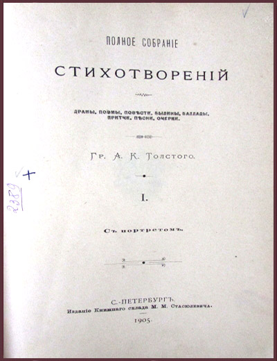 Антикварная книга в добротном полукожаном переплете. Старинное издание в хорошем состоянии, надрыв по корешку. 1 л. портр., XVI, 368, 332 cтр. Приплетены машинописные работы Толстого А.К.: Русская история от Гостомысла с IX по XIX век. Шутка-поэма графа А.К. Толстого. 1868 г. [22] стр.; Сон Попова: поэма. Сочинения графа А.К. Толстого. 1874 г. [24] стр. Шутка-поэма "Русская история от Гостомысла с IX по XIX век" графа Толстого А.К. закрепилась в обществе под названием "История государства российского от Гостомысла до Тимашева". Она в сатирическом стиле излагает основные факты российской истории. Написанная в 1868 году, "История..." впервые была опубликована в "Русской старине" лишь в 1883 году, уже после смерти Толстого А.К. До этого поэма широко распространялась в списках и снискала любовь читателей, продолжающуюся и по сей день. Библиография старинной книги: Лесман № 2237.