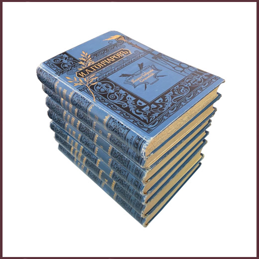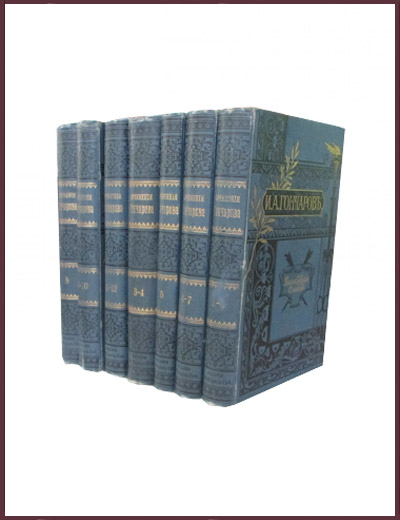 Комплект из семи антикварных книг в издательских коленкоровых тисненых в две краски переплетах. Небольшие потертости переплетов. Разлом заднего форзаца в т. 9-10, обоих форзацев - в т. 11-12. Редкие "лисьи" пятна в первых томах. Книжные блоки преимущественно чистые. Полное собрание сочинений И.А. Гончарова было напечатано в 12 томах и выпускалось в качестве приложения к журналу "Нива" за 1899 год. Содержание томов: Т. 1: С портретом автора, гравированным академиком И.П. Пожалостиным, и факсимиле. 272 стр., 1 л. портр., 1 л. факсим.; Т. 2: 242 стр.; Т. 3: 368 стр.; Т. 4: 268 стр.; Т. 5: 394 стр.; Т. 6: 272 стр.; Т. 7: 290 стр.; Т. 8: 448 стр.; Т. 9: 210 стр.; Т. 10: 320 стр.; Т. 11: 278 стр.; Т. 12: 284 стр.