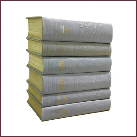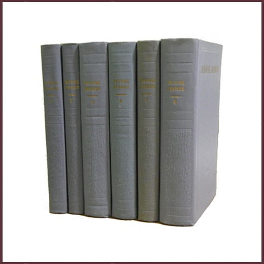 Комплект из шести букинистических книг в издательских переплетах, представляющий собой собрание сочинений русского прозаика и драматурга Леонида Леонова. Прижизненное издание автора. Вступительная статья Ковалева В.А. Печатался в 1953-1955 годах. Советскими букинистическими магазинами полный комплект книг оценивался в 10 рублей. Содержание томов: Т. 1. Барсуки. Роман. 1953 г. 367 стр., 1 л. портр.; Т. 2. Соть. Роман.- Саранча. Повесть. 1953 г. 360 стр.; Т. 3. Скутаревский. Роман [и др.]. 1953 г. 584 стр.; Т. 4. Дорога на океан. Роман. 1954 г. 552 стр.; Т. 5. Взятие Великошумска. Повесть [и др.]. 1954 г. 440 стр.; Т. 6. (Дополнительный). Русский лес. Роман. 1955 г. 759 стр.