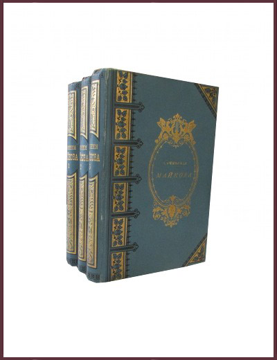 Комплект из трех антикварных книг в издательских переплетах эпохи. Черное и золотое тиснение по корешку и обложке, вензеля, виньетки. Блок второго тома полностью отошел от переплета. Трехсторонний мраморный обрез. С портретом автора и факсимиле стихотворения "Пустынник". Не хватает 4-го тома. Издание 7-е, исправленное и дополненное. Стоимость комплекта в советских букинистических магазинах составляла: 25 рублей без переплета и 35 рублей - в издательских переплетах. Содержание томов: Т. 1. Лирика. XVI, 600 стр.; Т. 2. Картины. (Стихотворения.) VIII, 560 стр., 1 л. факс.; Т. 3. Поэмы [и др.]. 4, II, 506 стр.; Т. 4. Стихотворения.- Проза. VIII, 618 стр., 1 л. портр.