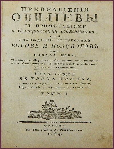 Превращения Овидиевы с примечаниями и историческими объяснениями, или похождение языческих богов и полубогов от начала мира, умноженное в рассуждении жизни сего знаменитого стихотворца с портретом и снабженное отличными картинами, в 3 томах (1794 г.)