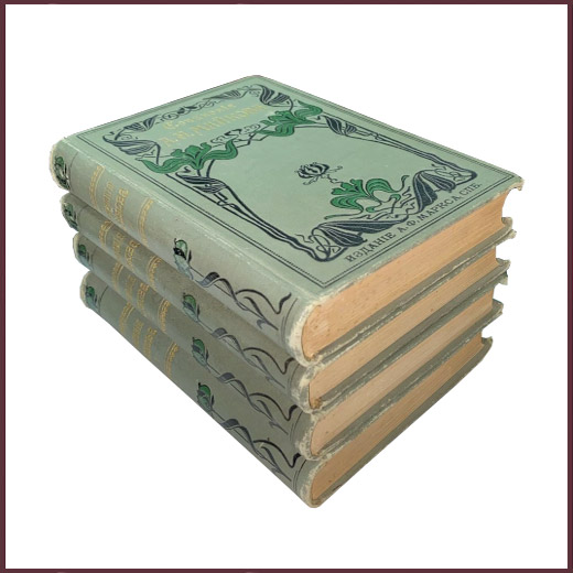 Комплект из четырех антикварных книг в твердых издательских переплетах. Узорчатое цветное тиснение. На страницах лисьи пятна. В первом томе - портрет автора с факсимиле; во втором - стихотворение автора, написанное от руки; в четвертом - портрет автора с папье-плюр. Седьмое издание полного собрания сочинений, исправленное и дополненное. Полный комплект в советских букинистических магазинах оценивался: без переплета - в 25 рублей, в переплетах - в 35 рублей. Содержание томов: Т. 1. Лирика. XVI, 600 стр. Т. 2. Картины. (Стихотворения.) VIII, 560 стр., 1 л. факс. Т. 3. Поэмы [и др.]. 4, II, 506 стр. Т. 4. Стихотворения.- Проза. VIII, 618 стр., 1 л. портр.
