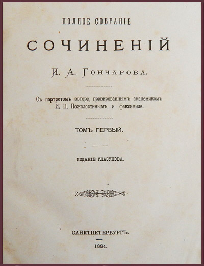 Комплект из восьми антикварных книг во владельческих полукожаных переплетах, представляющий первое полное собрание сочинений Гончарова. Потертые корешки и уголки. Незначительное загрязнение первых страниц от перелистывания. Лисьи пятна. Следы залития страниц 6-го тома. С портретом автора, гравированным академиком Пожалостиным И.П. и факсимиле. Печаталось Глазуновым в Санкт-Петербурге в 1884-1889 годах. В советских букинистических магазинах стоимость полного комплекта составляла: 15 рублей - без переплетов и 30 рублей - в переплетах. Содержание томов: Т. 1. Обыкновенная история. 1884 г. II, 187, 221 стр. Т. 2. Обломов. Ч. 1 и 2. 1884 г. 199, 186 стр. Т. 3. То же. Ч. 3 и 4. 1884 г., 119, 165 стр. Т. 4. Обрыв. Ч. 1 и 2. 1884 г. VIII, 477 стр. Т. 5. То же. Ч. 3, 4 и 5. 1884 г. VIII, 560 стр. Т. 6. Фрегат "Паллада". Очерки путешествия. Т. 1. 1884 г. XII, 408 стр., 1 л. портр. Т. 7. То же. Т. 2. 1884 г. X, 583 стр. Т. 8. Литературный вечер [и др.]. 1884 г. 274 стр. Т. 9. Воспоминания.- Слуги старого века. 1889 г. 265 стр.