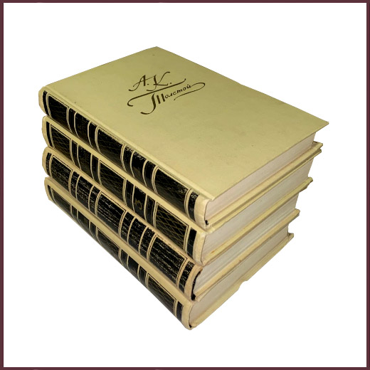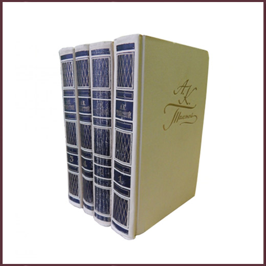 Комплект из четырех букинистических книг в издательских переплетах. Твердый ледериновый светло-палевый с тиснением и позолотой переплет. Собрание сочинений вышло под редакцией и со вступительной статьей И. Ямпольского. Иллюстрации художника Ильи Глазунова. Содержание томов: Т.1 Лирические стихотворения, баллады, былины, притчи, сатирические и юмористические стихотворения, поэмы, переводы. Т. 2 Художественная проза: "Упырь", "Семья вурдалака. Неизданный отрывок из записок неизвестного", "Встреча через триста лет", "Два дня в Киргизской степи", "Волчий приемыш", "Артемий Семенович Бервенковский", "Амена" (отрывок из романа "Стебловский") и повесть времен Иоанна Грозного "Князь Серебряный". Т. 3 Драматическая трилогия: "Смерть Иоанна Грозного", "Царь Федор Иоаннович", "Царь Борис", а также статьи. Т. 4 Драматические произведения: "Дон Жуан", "Посадник", "Фантазия" и избранные письма.