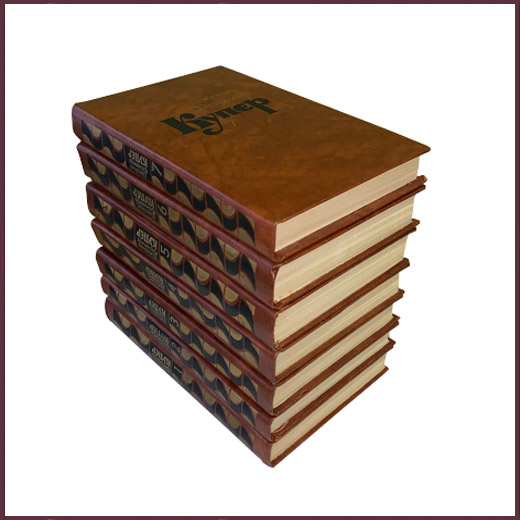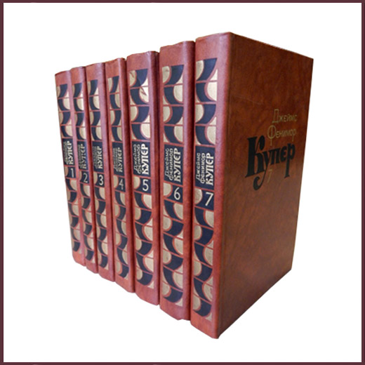 Комплект из семи букинистических книг в твердых издательских переплет. Цветные и черно-белые тоновые иллюстрации И. Ушакова. Составление, общая редакция, вступительная и заключительная статьи Иванько С.С. Содержание томов: Т. 1. Шпион, или Повесть о нейтральной территории. Т. 2. Пионеры, или У истоков Саскуиханны. Т. 3. Последний из могикан, или повесть о 1757 годе. Т. 4. "Прерия". Т. 5. Следопыт, или На берегах Онтарио. Т. 6. Зверобой, или Первая тропа войны. Т. 7. Моникины.