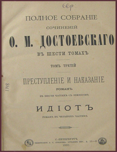 Антикварная книга в коленкоровом переплете с тиснением по обложке. Небольшие следы от краски. Следы профессиональной реставрации на переднем форзаце. Текст напечатан в два столбца. В третьем томе известного 6-томника, изданного Достоевской А.Г. в 1885-1886 годах, опубликованы два наиболее известных романа автора - "Идиот" и "Преступление и наказание". Поэтому данный том вполне может рассматриваться в качестве самостоятельной книги.