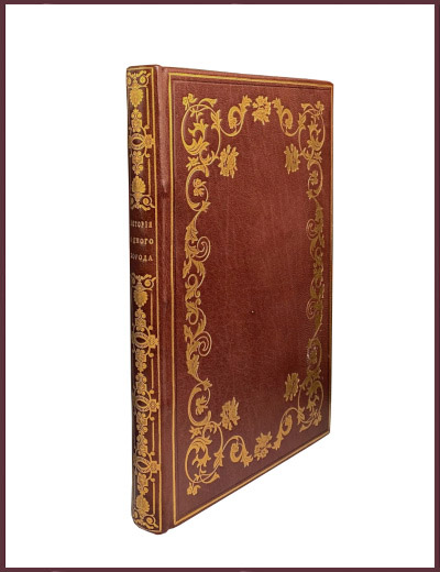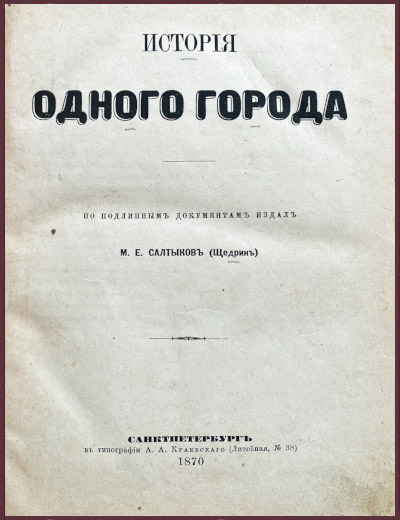 Антикварная книга в роскошном цельнокожаном современном переплете. На корешке обильная тисненая золотом орнаментика. По периметру передней и задней крышек - золотые линейки с мотивами растительного орнамента. Золотисненная дублюра обеих крышек, украшенная линейками и растительным орнаментом. На внутренней стороне бювара муаровые форзацы. Следы реставрации блока. Редкие временные пятна и следы залития страниц. По подлинным документам издал М.Е. Салтыков (Щедрин). Прижизненное издание автора. На антикварном рынке встречается редко. Старинная книга представляет собой первое издание сатирического романа-хроники "История одного города", написанного Салтыковом-Щедриным в 1869-1870 годах. Роман представляет собой летопись вымышленного города Глупова. Ни одно другое произведение в русской и мировой художественной литературе не подвергало столь яростному обличению и беспощадному суду российское самодержавие, как роман Салтыкова-Щедрина.