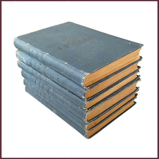 Комплект из шести антикварных книг в коленкоровых переплетах. Золотое и фигурное тиснение по корешку и обложке. Есть синие штампы и пометы ручкой. В указанных томах полного собрания сочинений собраны материалы, написанные Виссарионом Григорьевичем для журнала "Отечественные записки" в 1840-1842 годах.