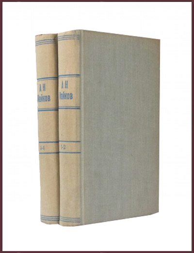 Комплект из двух антикварных книг во владельческих ледериновых переплетах эпохи. С критико-биографическим очерком. Издание девятое, исправленное и дополненное под редакцией Быкова П.В. Напечатано в Санкт-Петербурге в 1914 году в качестве приложения к журналу "Нива" (вышло в 8 книгах), поэтому издательских переплетов никогда не имело. Это было последнее издание Майкова А.Н. в дореволюционной России, цена на собрание сочинений в советских антикварных магазинах доходила до 20 рублей. Содержание томов: Т. 1. XLVII, 318 стр., 1 л. портр.; Т. 2. 224 стр.; Т. 3. 285 стр.; Т. 4. 367 стр.