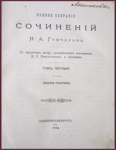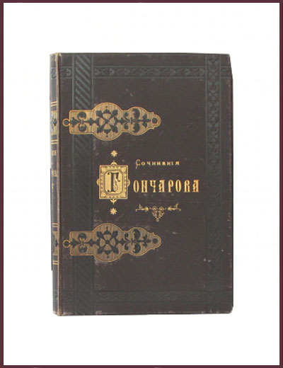 Комплект из восьми антикварных книг в издательских переплетах. Золотое и черное тиснение по корешку и обложке. С портретом автора, гравированным академиком Пожалостиным И.П. и факсимиле. Имеются временные пятна. Тисненный экслибрис и владельческие подписи Аничковых на титульных листах. Представляет собой первое прижизненное полное собрание сочинений Гончарова И.А., которое было издано Глазуновым в 1884 году в Санкт-Петербурге. Спустя пять лет был допечатан дополнительный 9-й том, который ныне встречается редко. Содержание томов: Т. 1. Обыкновенная история. 1884. II, 187, 221 стр., Т. 2. Обломов. Ч. 1 и 2. 1884. 199, 186 стр., Т. 3. То же. Ч. 3 и 4. 1884, 119, 165 стр., Т. 4. Обрыв. Ч. 1 и 2. 1884. VIII, 477 стр., Т. 5. То же. Ч. 3, 4 и 5. 1884. VIII, 560 стр., Т. 6. Фрегат "Паллада". Очерки путешествия. Т. 1. 1884. XII, 408 стр., 1 л. портр., Т. 7. То же. Т. 2. 1884. X, 583 стр., Т. 8. Литературный вечер [и др.]. 1884. 274 стр. Экземпляр из личной библиотеки Евгения Васильевича Аничкова и его сына - Игоря Евгеньевича Аничкова.