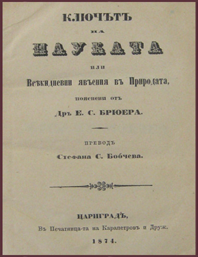 Антикварная книга в цельном кожаном переплете, корешок с бинтами и золотым тиснением. На одной из страниц следы самостоятельной реставрации. Титульный лист немного надорван. Перевод на болгарский Стефана Бобчева. Болгарское издание книги английского ученого доктора Брюера, под чьей обложкой оказались соединены вместе описания сразу множества научных областей, среди которых статьи по метеорологии, акустике, оптике, органической и неорганической химии, зоологии. Отдельная глава посвящена электричеству и его природе.
